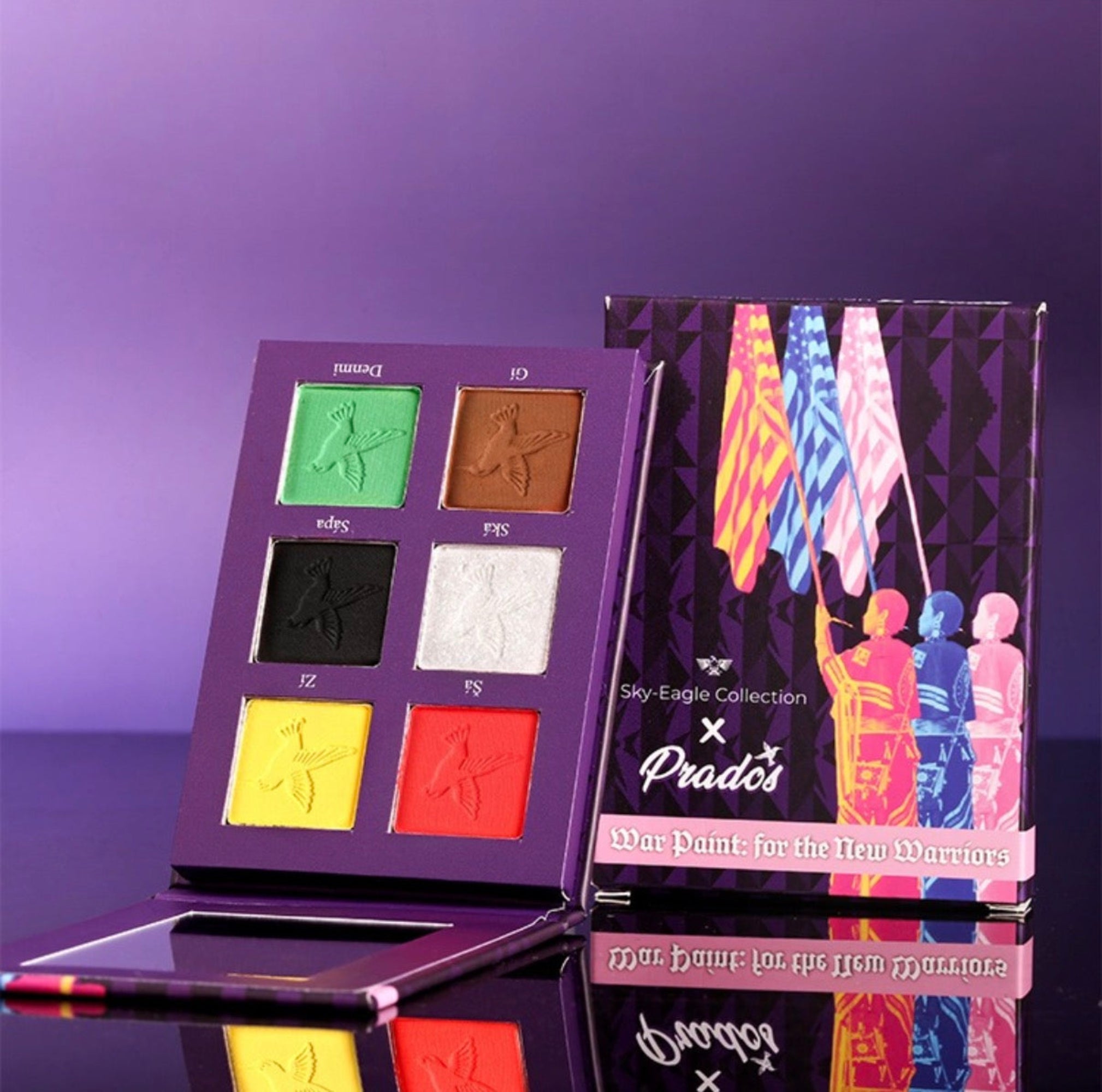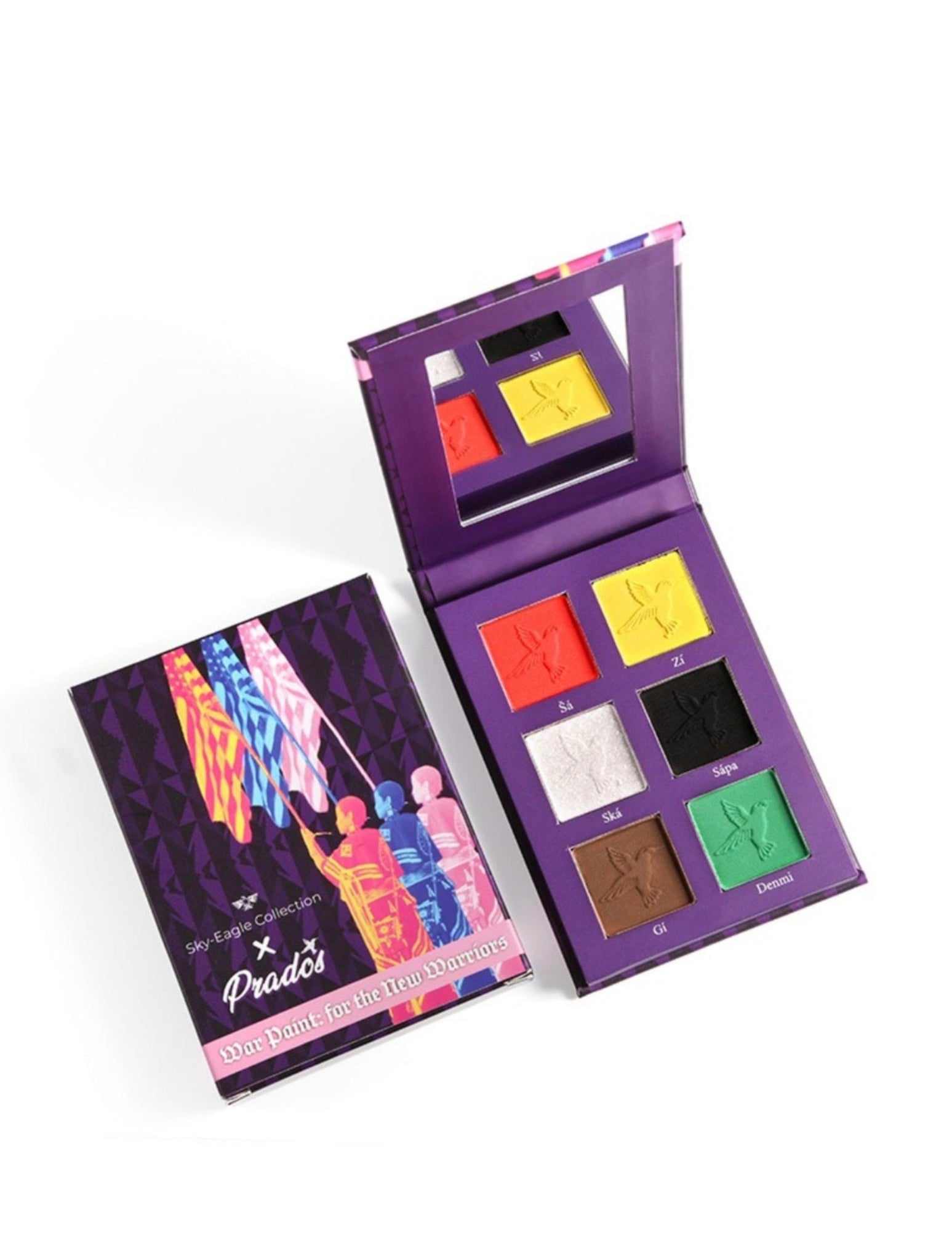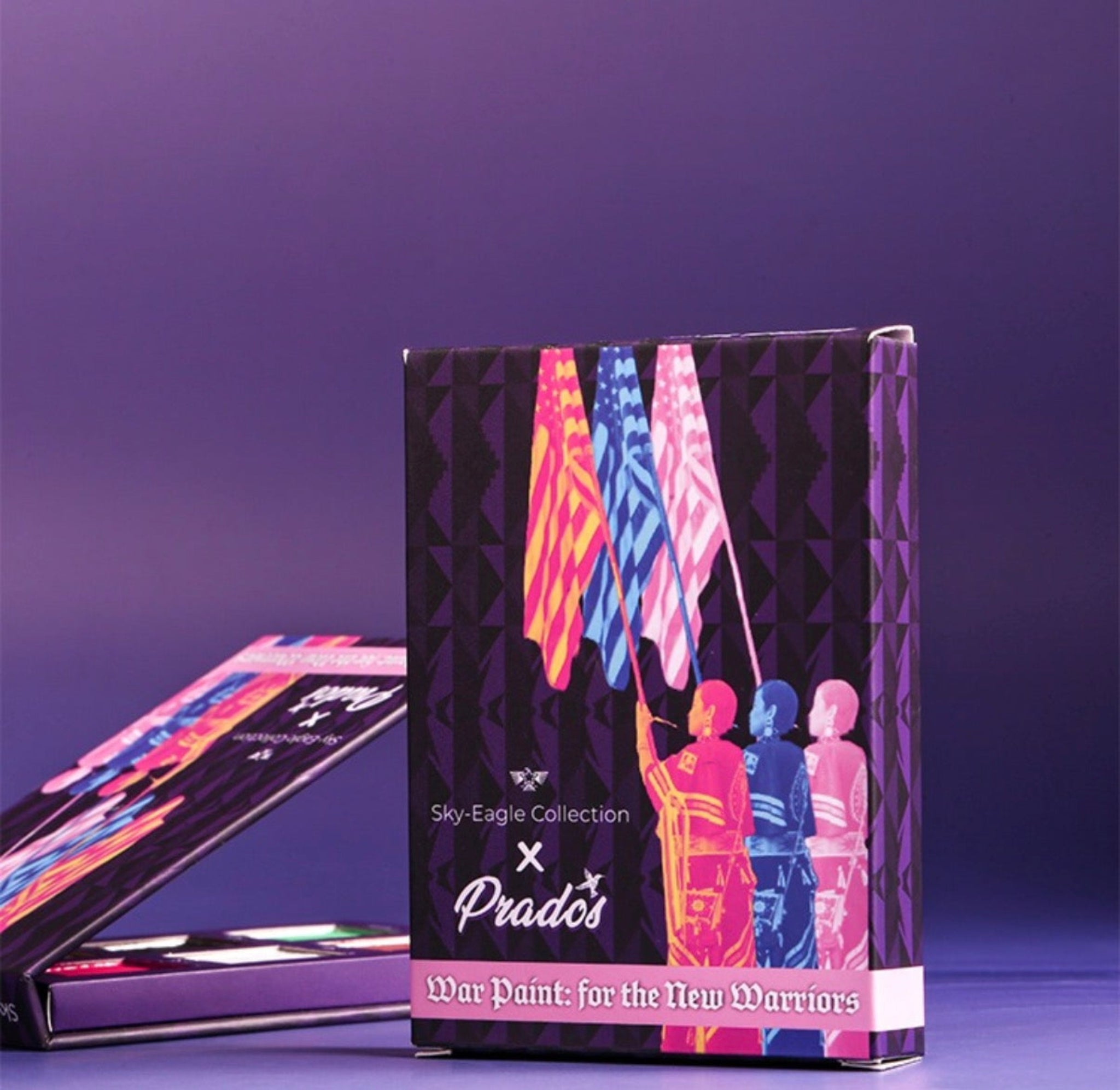 The limited edition WAR PAINT Palette is a collaboration between two Native-owned & Indigenous-led brands — Sky-Eagle Collection and Prados Beauty — artwork & color story featuring Misty Lakota, Lakota Veteran and Honor Guard.